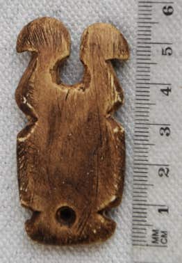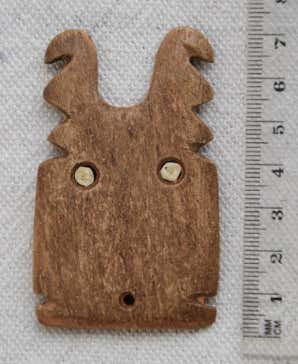 Gefunden wurde das Original dieser Replik in Matmar in Ägypten, sie wurde in Originalgrösse (6,4 x 11,8 cm) aus ägyptischem Kalkstein gearbeitet und datiert in die Naqada-I-Zeit (ca. 3.900 BC). Das Original liegt sicher verwahrt im Britisch Museum. Mich erinnert die offene Form an eine spätere Doppel-Vogelkopf-Darstellung.
