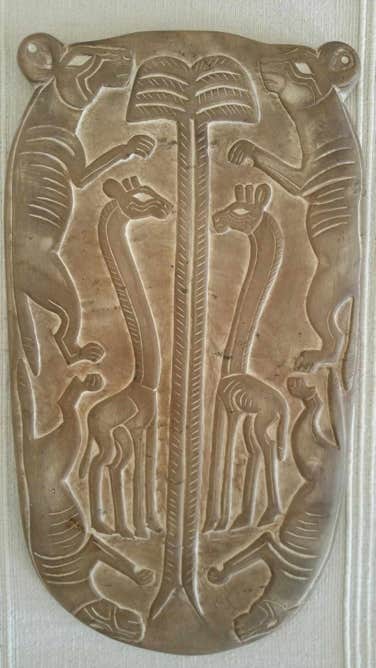 Es handelt sich um eine Nachbildung der sogenannten „Gerzeh- oder Kuhpalette“, diese Kosmetikpalette hat biomorphe und astrale Motive. Das Original befindet sich im Ägyptischen Museum Kairo. Gefunden wurde sie in Grab 59 in Gerzeh während einer Ausgrabung Flinders Petrie im Jahr 1911. Das Original wird datiert auf die Naqada-II-Periode (ca. 3.400-3.200 BC)