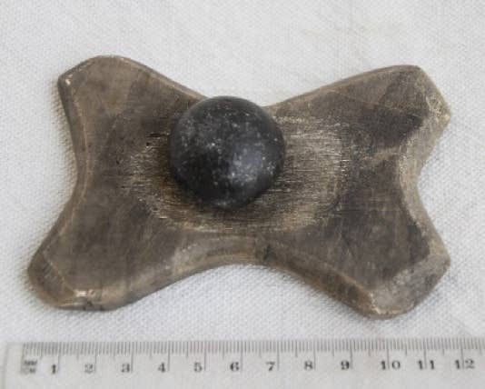 Das Original dieser x-förmigen Palette weist auf beiden Seiten Gebrauchsspuren auf, die Replik wurde in Originalgrösse (11,8 x 7,9 cm) aus ägyptischem Kalkstein nachgearbeitet. Datiert wird das Original, welches sich im Museum of Mediterranean and Near Eastern Antiquities in Schweden befindet, in die Badari-Zeit (5.500-4.000 BC). Mit diesen Paletten wurden Pigmente für Schminke u.ä. zerrieben. Der beigefügte runde Reibstein stammt aus den thebanischen Bergen bei Luxor und ist ein Fundstück der modernen Zeit.